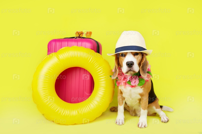 Собака породы бигль в соломенной шляпе и гавайском цветочном ожерелье у чемодана, плавательный круг