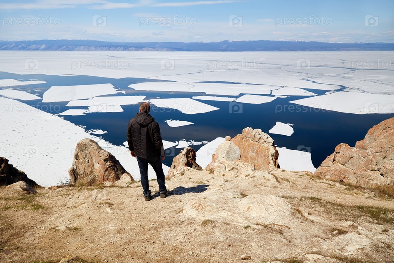 Озеро Байкал весной. Мужчина-путешественник наслаждается прекрасным пейзажем