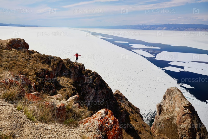 Озеро Байкал весной. Девушка стоит на камне с поднятыми руками