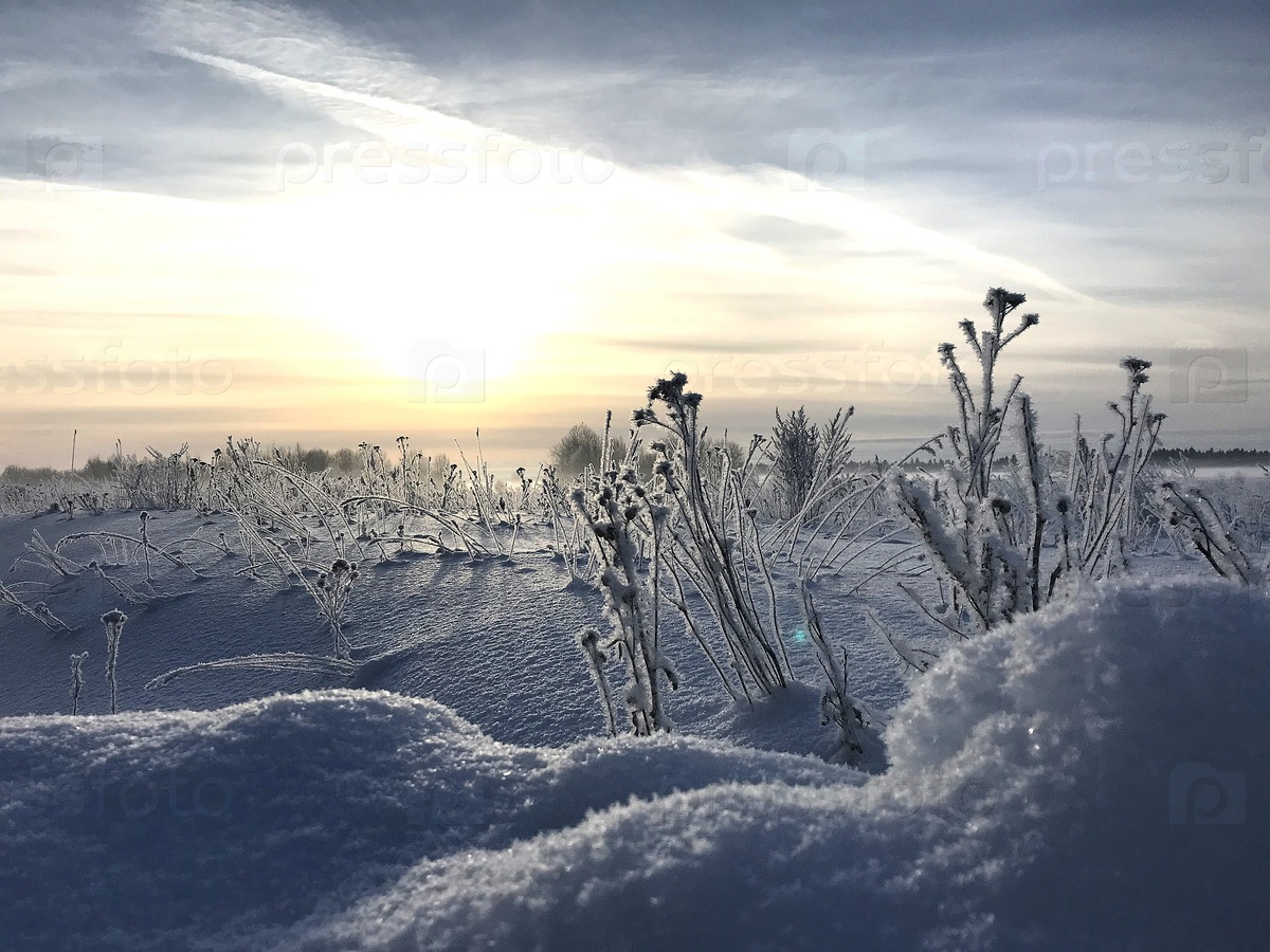 Зимний пейзаж с заснеженными деревьями и кустарниками