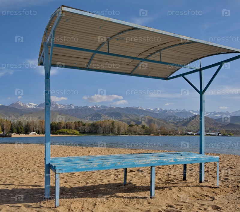 Кыргызстан. Вид на песчаный пляж с металлическими лавками для отдыхающих на Северо-Западном берегу озера Иссык-Куль