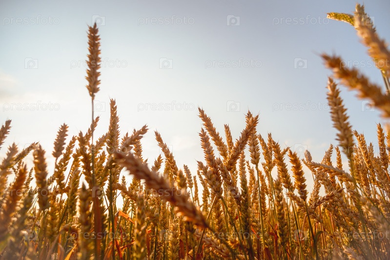 Спелые золотистые колосья пшеницы под голубым небом в солнечный день, крупный план