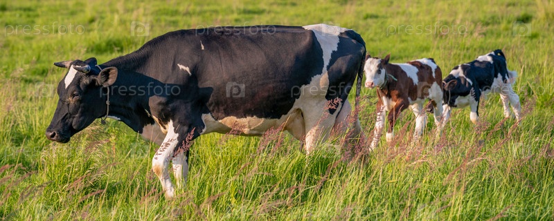 Коровы пасутся на сочном лугу в летний день