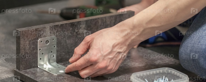 Мастер работает с деревянными панелями, собирает мебель с использованием железной фурнитуры