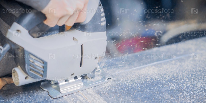 Плотник режет деревянную панель электроинструментом