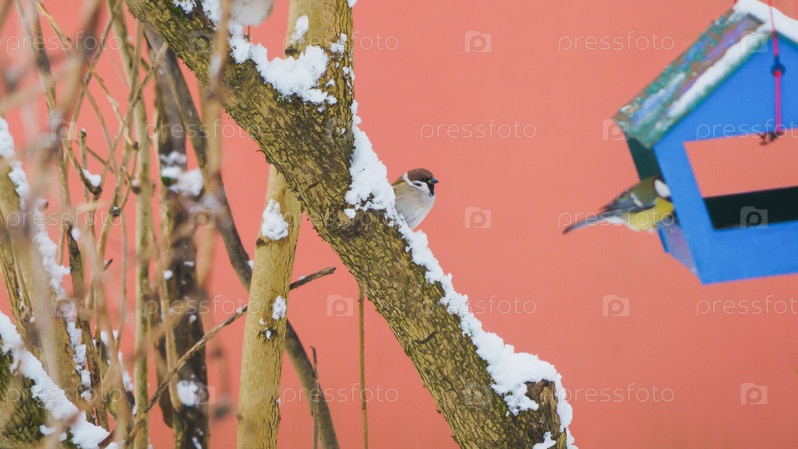Птицы в кормушке холодным зимним днем