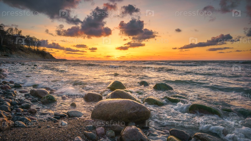 Чудесный оранжевый закат на скалистом берегу моря