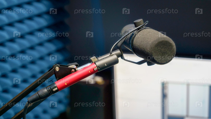 Микрофон в студии звукозаписи, крупный план, размытый фон