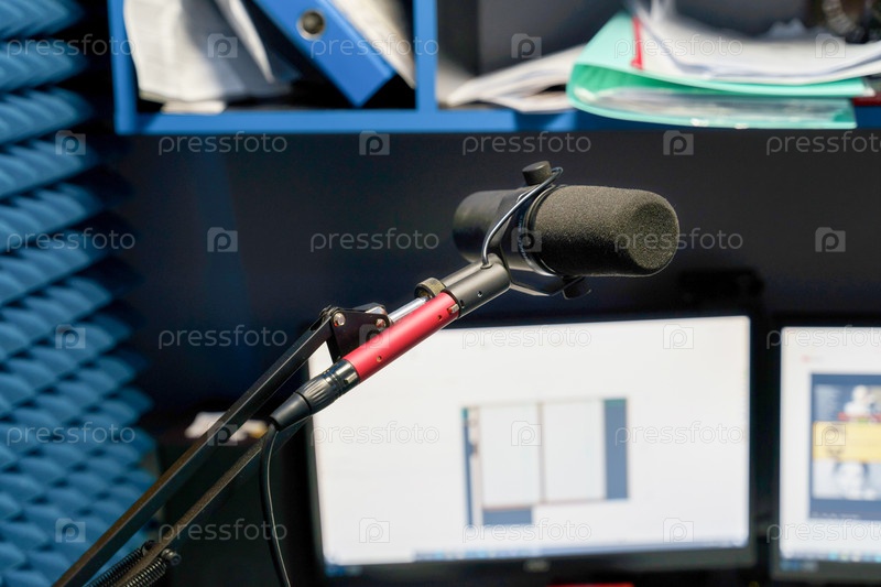 Микрофон в студии звукозаписи, крупный план, размытый фон