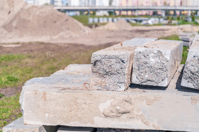 Строительные работы в городе, бетонные сваи, на фоне высотных зданий