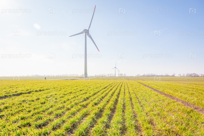 Ветряная турбина на зеленом поле с солнечными бликами на фоне голубого неба