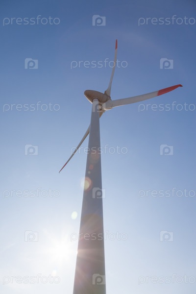 Ветряная турбина с солнечными бликами на фоне голубого неба, вид снизу