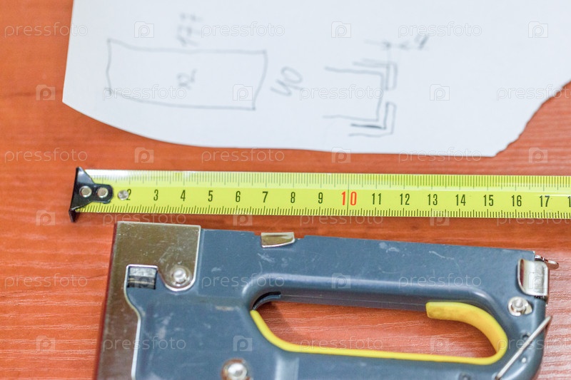 Чертеж с расчетами и желтой метрической лентой на столе, крупный план, размытый фон