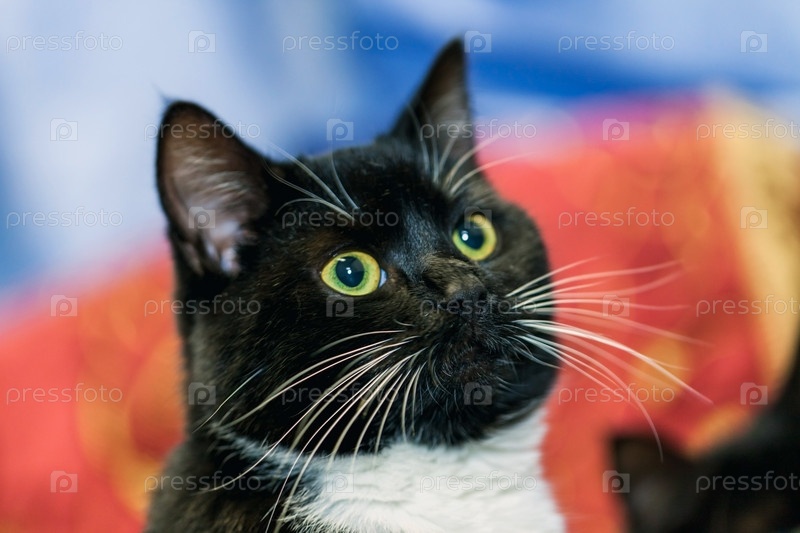 Черный кот с белыми усами и зелеными глазами позирует на портрете