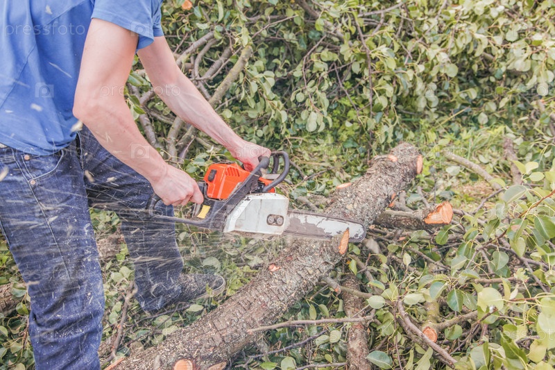 Мужчина с бензопилой пилит дерево, упавшее после урагана