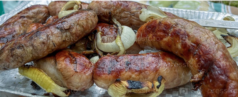 В лесу на открытом воздухе жарят колбаски для барбекю
