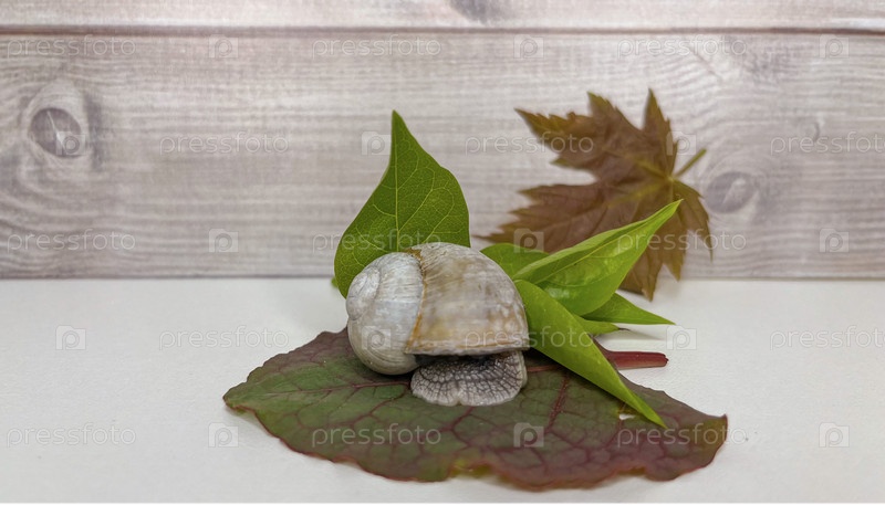 Улитка ползет по траве на столе в доме