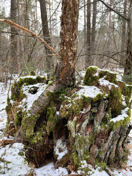 Зимой в лесу стоит сосна с корнями, покрытая зеленым мхом и снегом