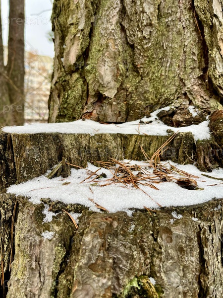 Зимой в лесу стоит сосновый бревенчатый дом, покрытый зеленым мхом и снегом