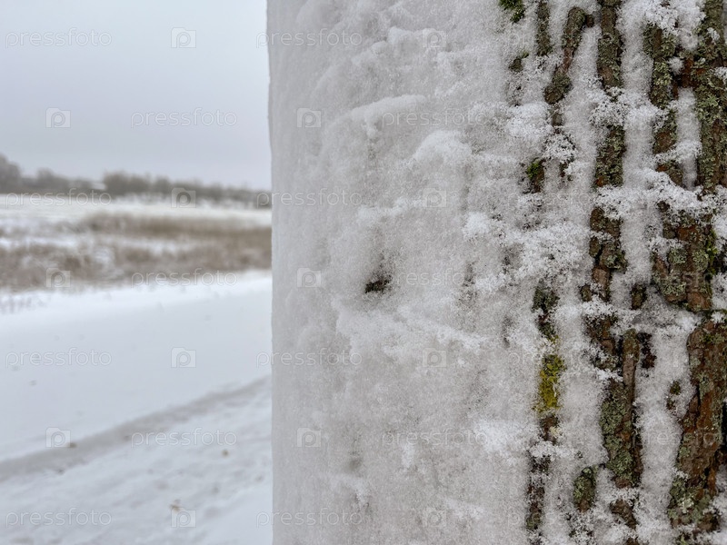 Заснеженный ствол дерева на фоне реки Днепр подо льдом