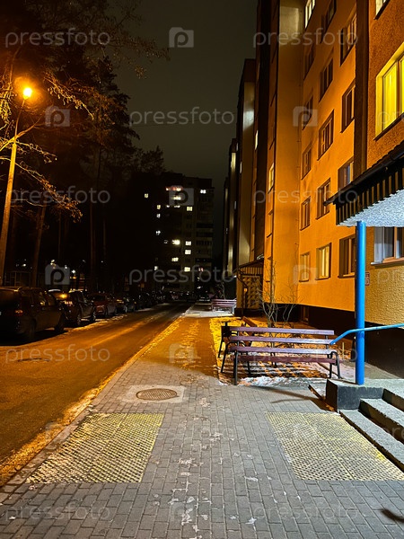 Городской двор зимним вечером с освещенными входами