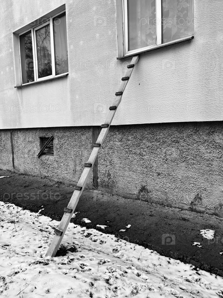 Старый дом с лестницей к окну первого этажа для домашних животных