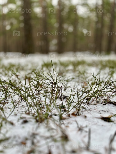 Пейзаж зеленый кустарник растет в зимнем лесу