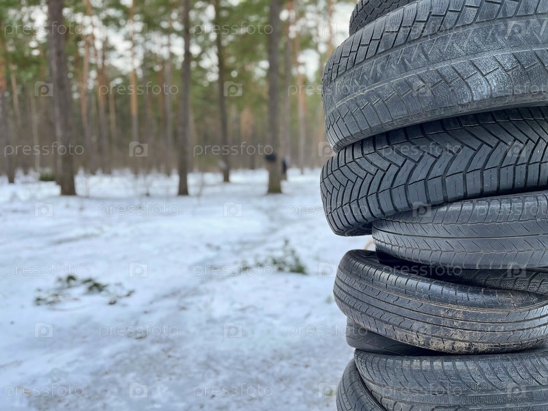 Использованные шины на фоне зимнего леса