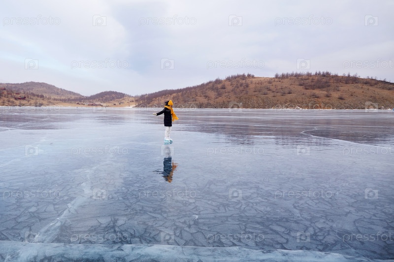 Молодая девушка катается на коньках по прозрачному льду замерзшего озера Байкал