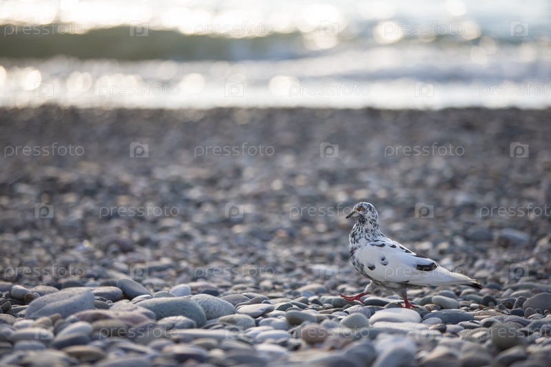 Важный голубь рябой окраски прогуливается по скалистому берегу моря