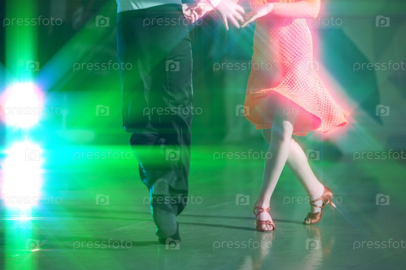 Абстрактный фон бальных танцев в лучах сценического освещения. Ноги танцоров совершают танцевальные движения