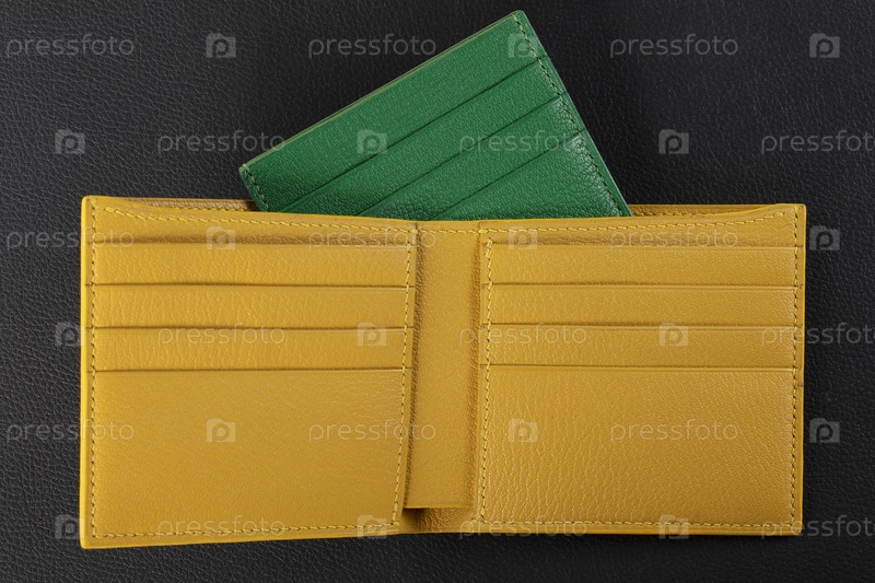 Изделия из кожи. Кошелек-визитница из натуральной кожи зеленого и желтого цвета на черном фоне