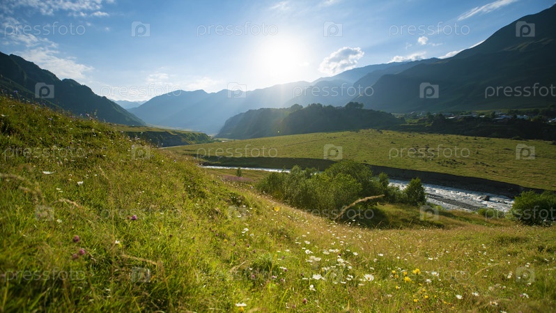 Красивый вид на горы, освещенные солнцем летом. Грузия, Европа. Кавказские горы