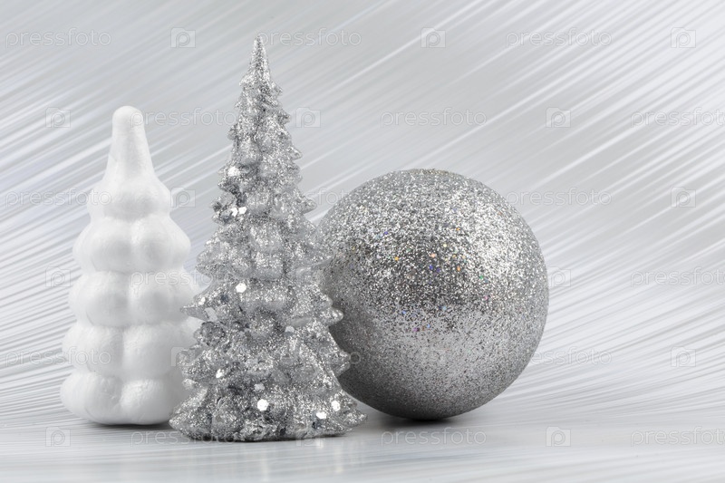Рождественский или новогодний фон с серебряной заснеженной елкой и серебряным переходным украшением. Яркий праздничный фон