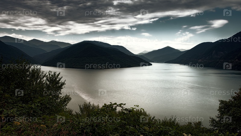 Вечерний драматический горный пейзаж, озеро и горный хребет, панорама, Грузия