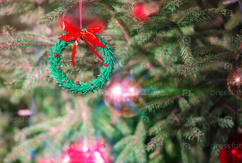 Рождественский фон с красивой елочной игрушкой и световыми лучами гирлянды
