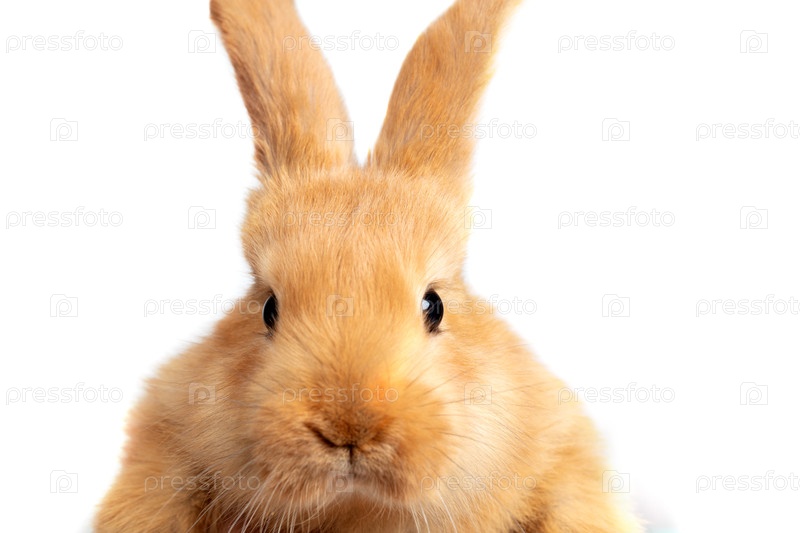 Морда рыжего кролика крупным планом на белом фоне