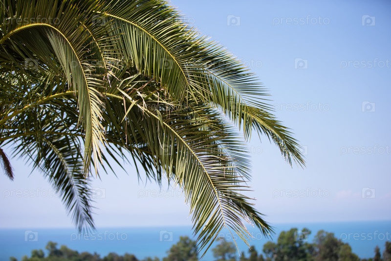 Пальмовые ветви на фоне голубого неба и моря. Тропический пейзаж для релаксации