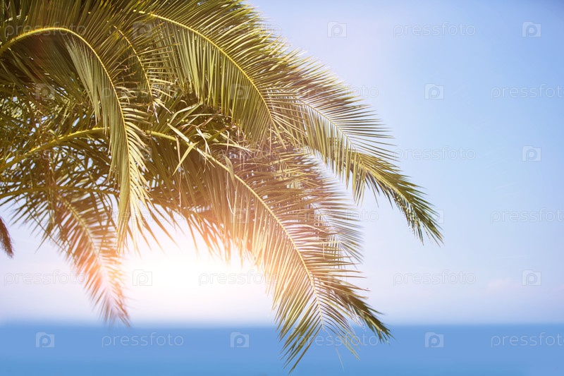 Пальмовые ветви на фоне голубого неба и закатного моря. Тропический пейзаж для отдыха