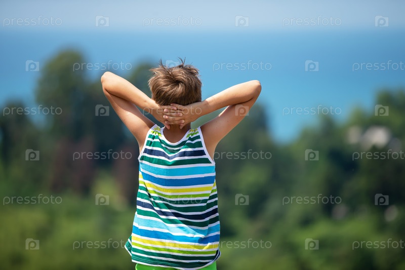Мальчик стоит, сложив руки перед головой, и любуется прекрасным пейзажем
