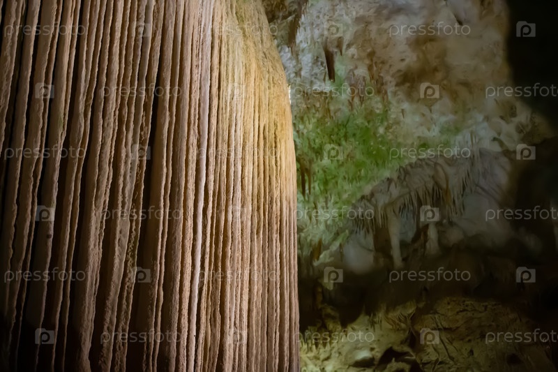 Пещера карстовая, потрясающий вид на сталактиты и сталагниты, освещенные ярким светом, прекрасная природная достопримечательность в туристическом месте