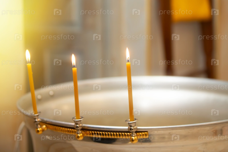 Фон церкви с крестильной ванной и горящими свечами