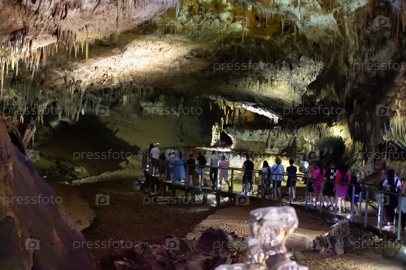 Пещера карстовая, потрясающий вид на сталактиты и сталагниты, освещенные ярким светом, прекрасная природная достопримечательность в туристическом месте