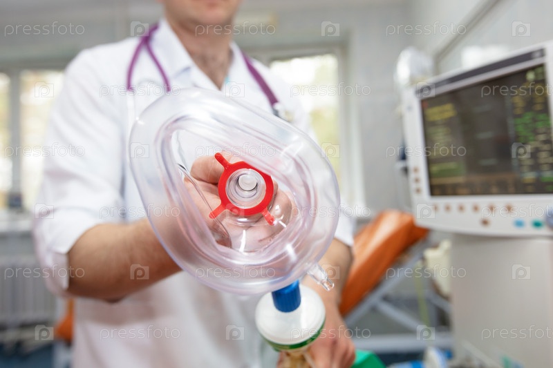 Рука хирурга с кислородной маской на фоне медицинских приборов