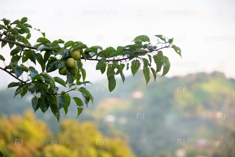 Ветка с грушами на размытом зеленом фоне