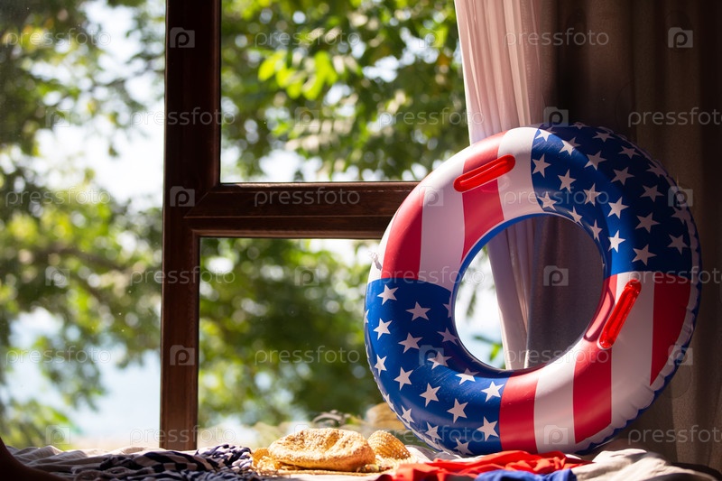 Надувной круг для плавания с принтом американского флага на фоне окна. Пляжный отдых в Америке