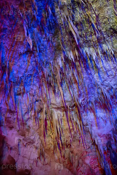 Карстовая пещера, потрясающий вид на сталактиты и сталагниты в красочном ярком свете, красивая природная достопримечательность в туристическом месте