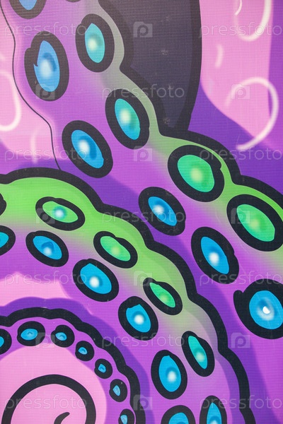 Абстрактное фиолетовое граффити с закрученным волнистым узором и сине-желтыми кругами