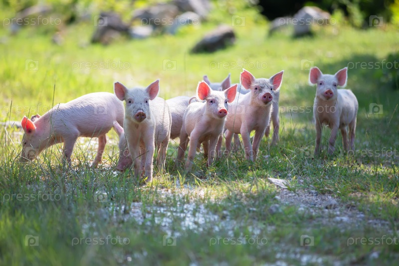 Забавные маленькие поросята гуляют на природе.Забавные маленькие поросята гуляют на природе. Группа розовых милых поросят бежит по траве