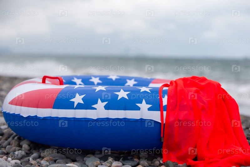 Спасательный круг с американским флагом на берегу моря. Отпуск на американских пляжах